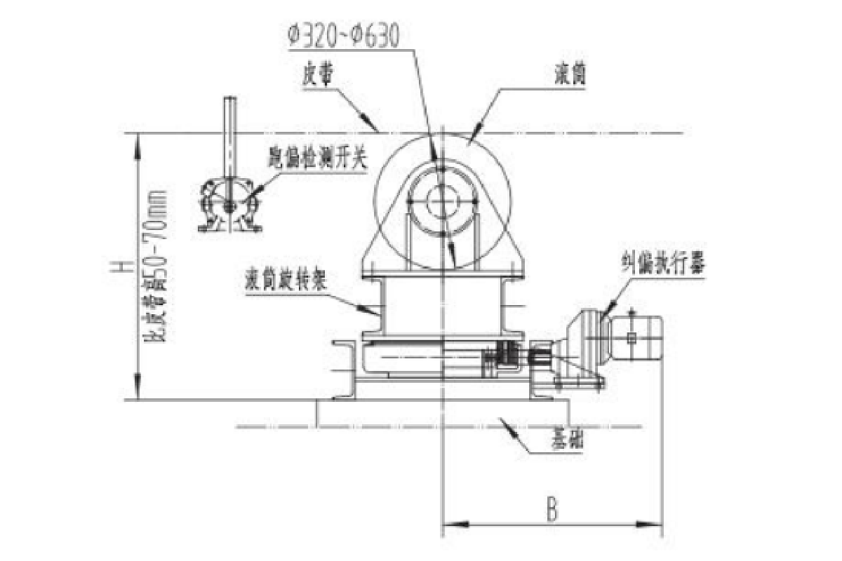 2、结构组成:JPT 型全自动皮带纠偏调整轮装置包含:底座,纠偏滚筒,跑偏检测,回转支撑机构,调整执行机构,PLC 控制箱等组成。